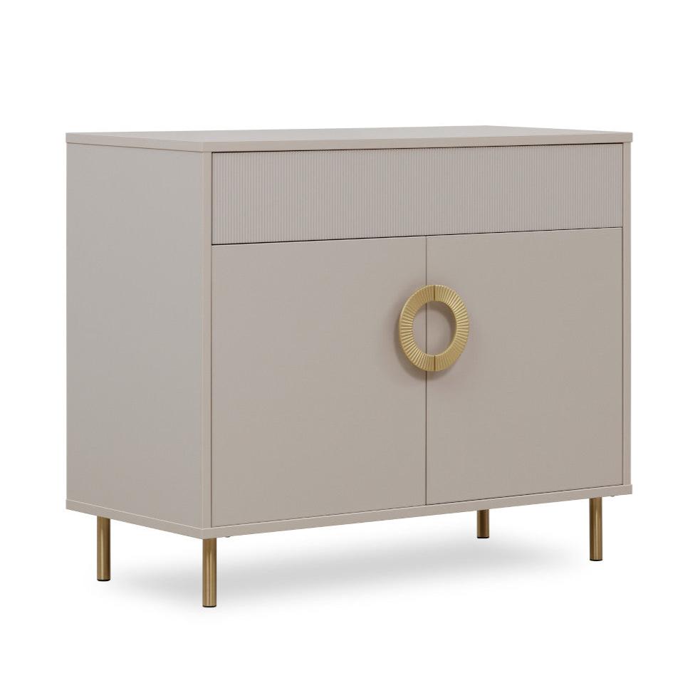 Kumodes un naktsgaldiņu zeltainās kājas norāda uz rokturu krāsu.