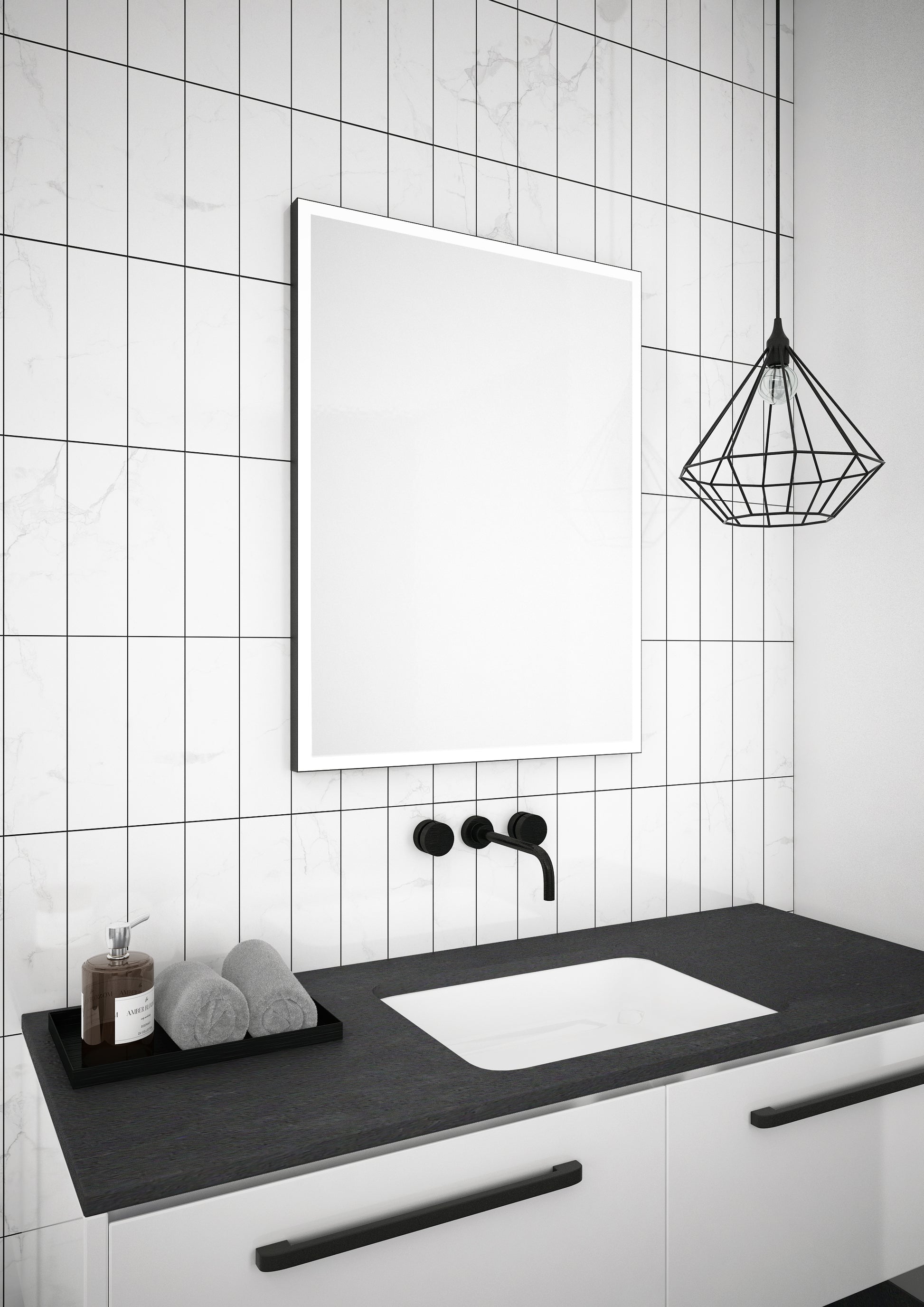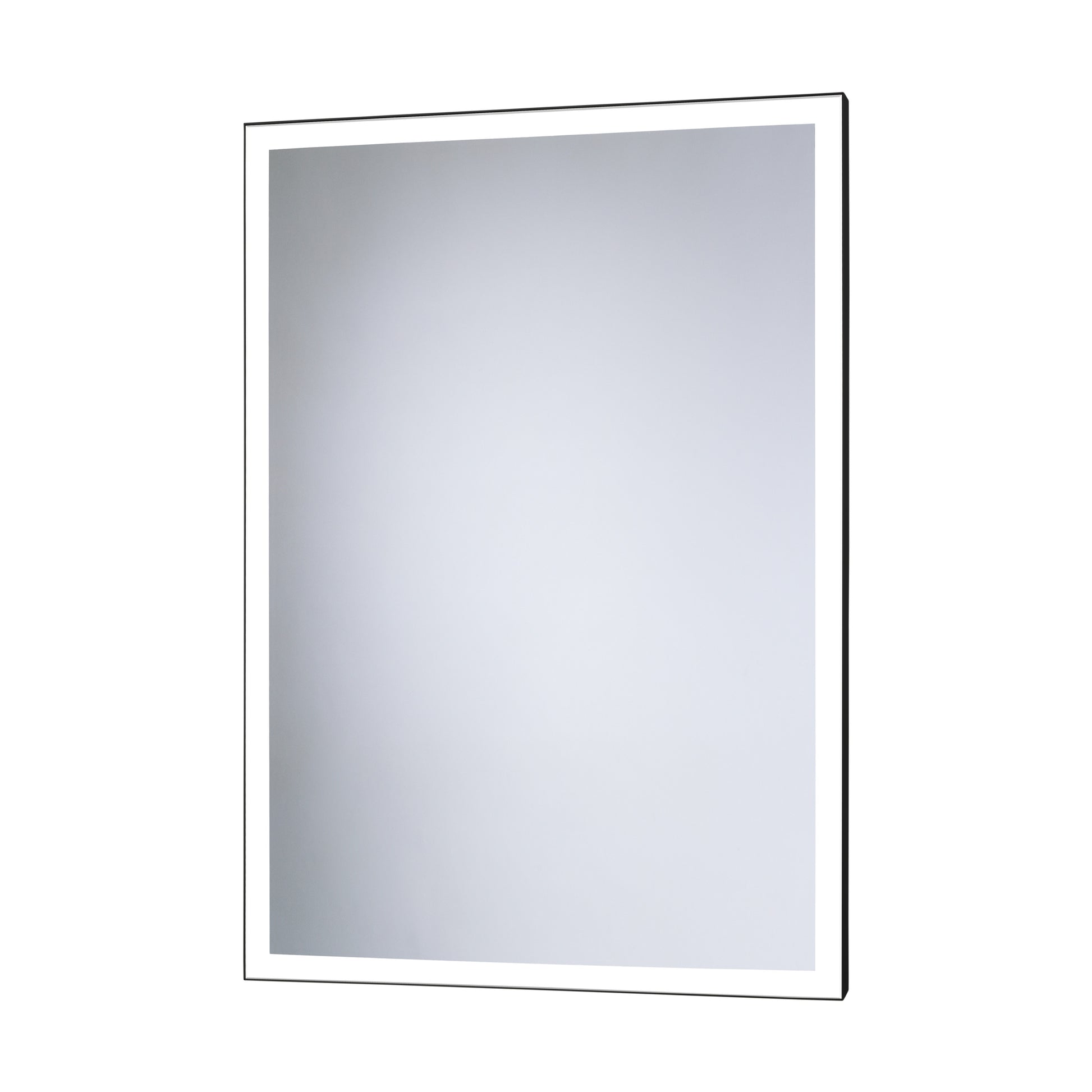 Taisnstūra spogulis ar noapaļotiem stūriem alumīnija rāmī. 1,8 cm platā perimetra josla ir apgaismota ar LED diodēm. Var pakārt vertikāli vai horizontāli. Rāmja krāsa - matēti melna.