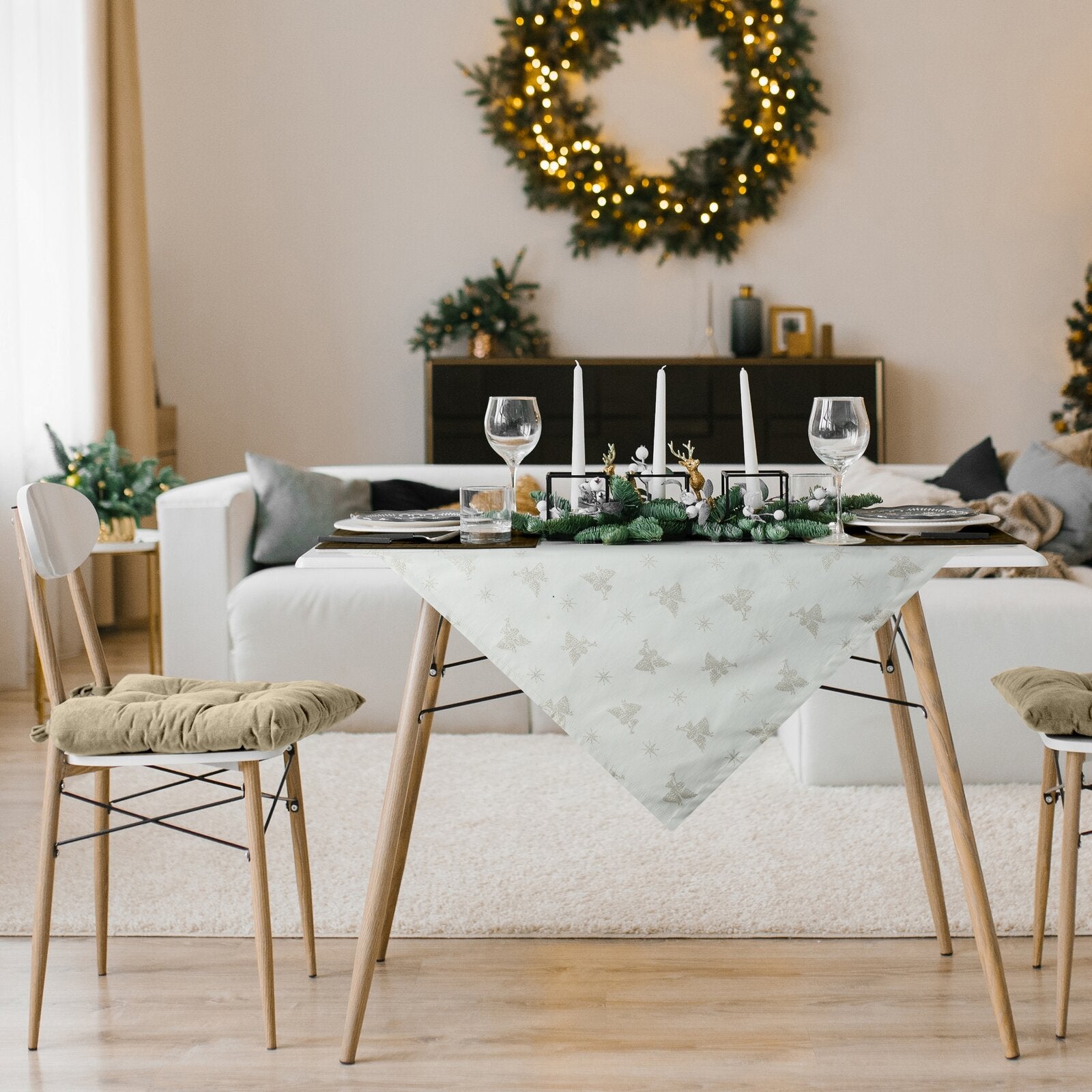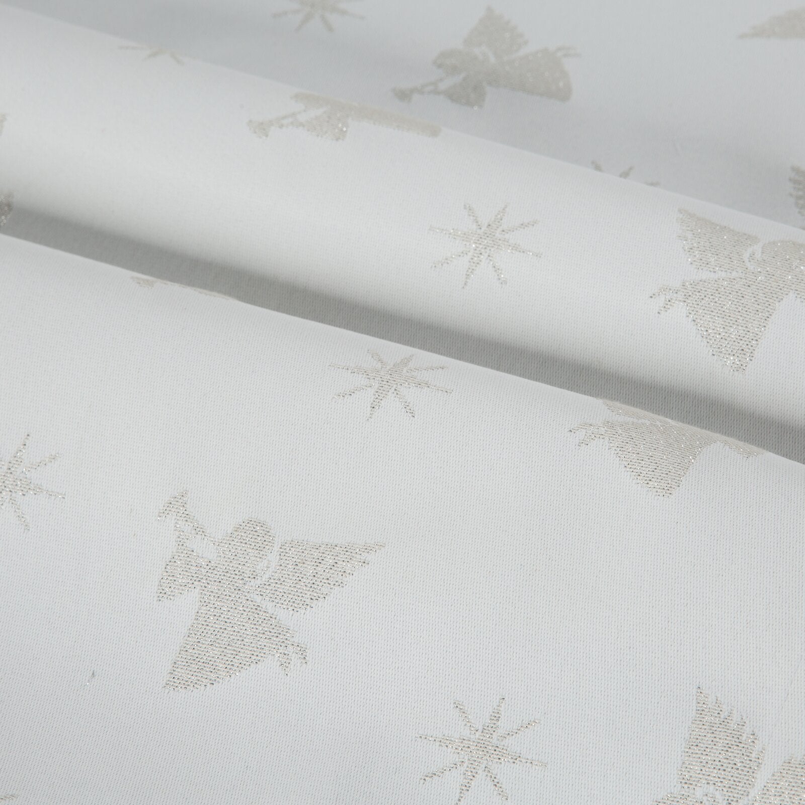 Spīdīgs galdauts ar Ziemassvētku motīvu platums: 40 cm, garums: 140 cm, krāsa: šampanieša, sastāvs: Sastāvs: 65% poliestera, 27% kokvilnas, 8% metālisku diegu.
