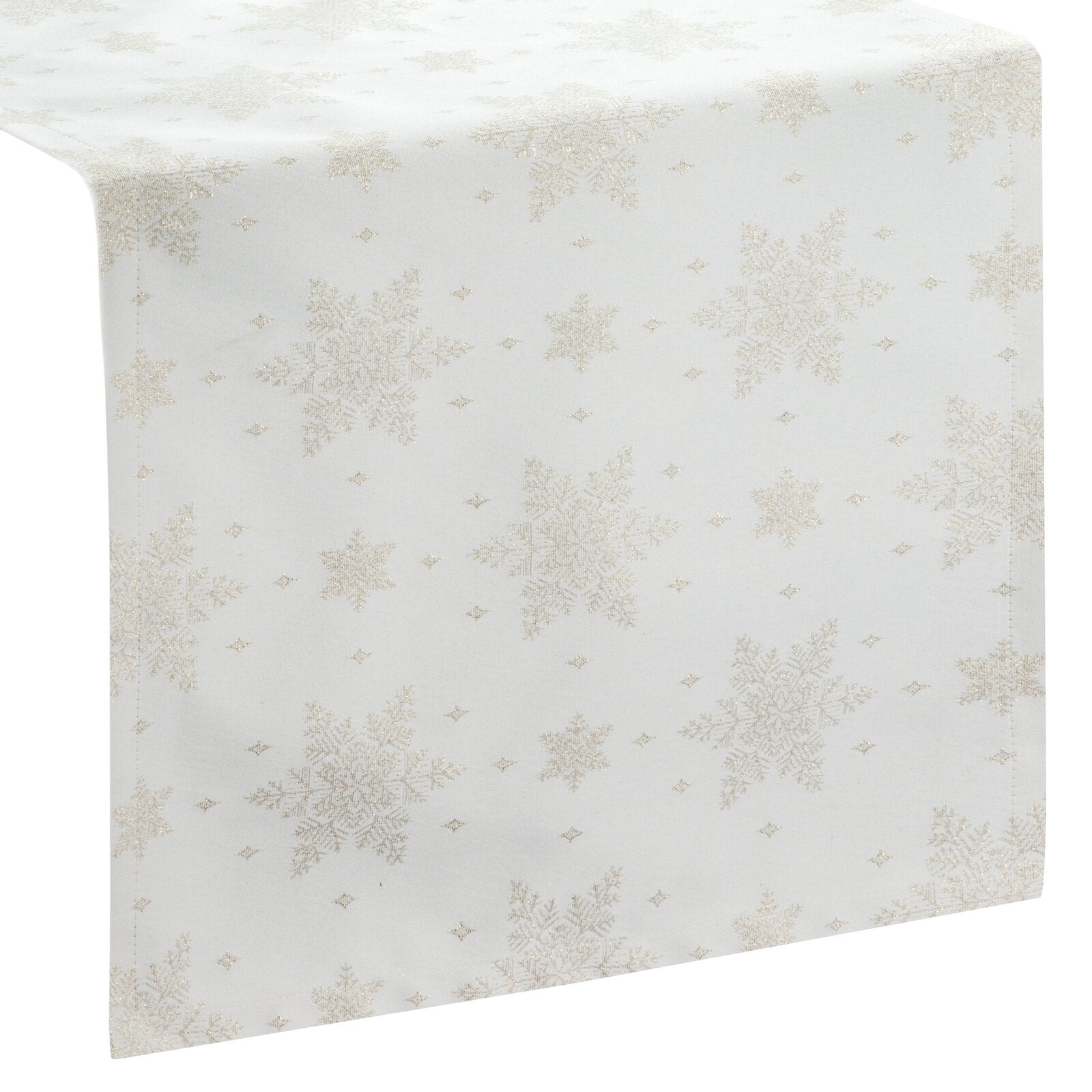 Spīdīgs galdauts ar Ziemassvētku motīvu platums: 40 cm, garums: 180 cm, krāsa: zelta, sastāvs: Sastāvs: 65% poliestera, 27% kokvilnas, 8% metālisku diegu.