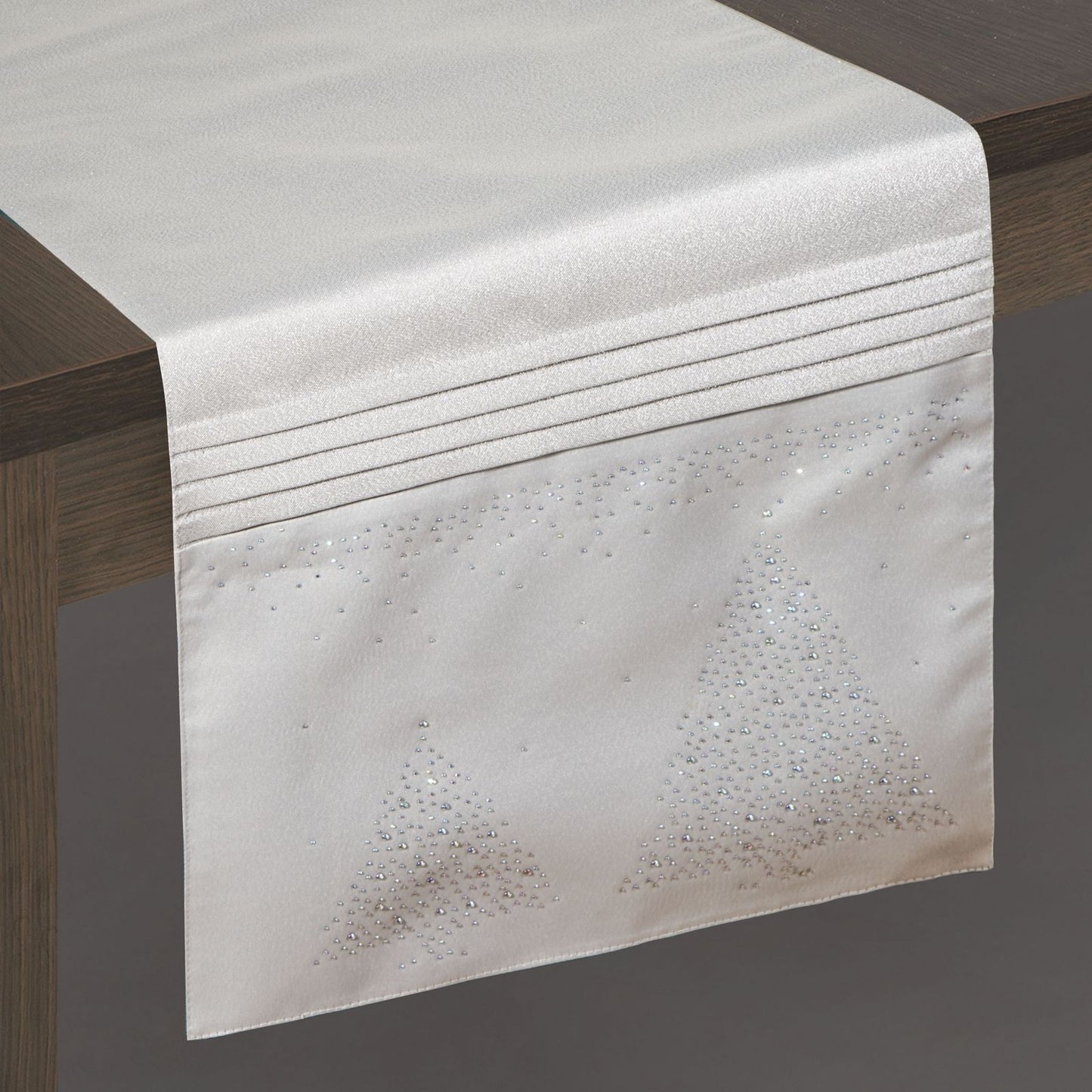 Svētku Ziemassvētku galda skrējējs no vienkārša auduma. Īsākās malas rotātas ar spīdīgiem cirkoniem un izteiksmīgām cilpiņām. platums: 35 cm, garums: 140 cm, krāsa: krēmkrāsa, sastāvs: Materiāls: 100% poliesters.