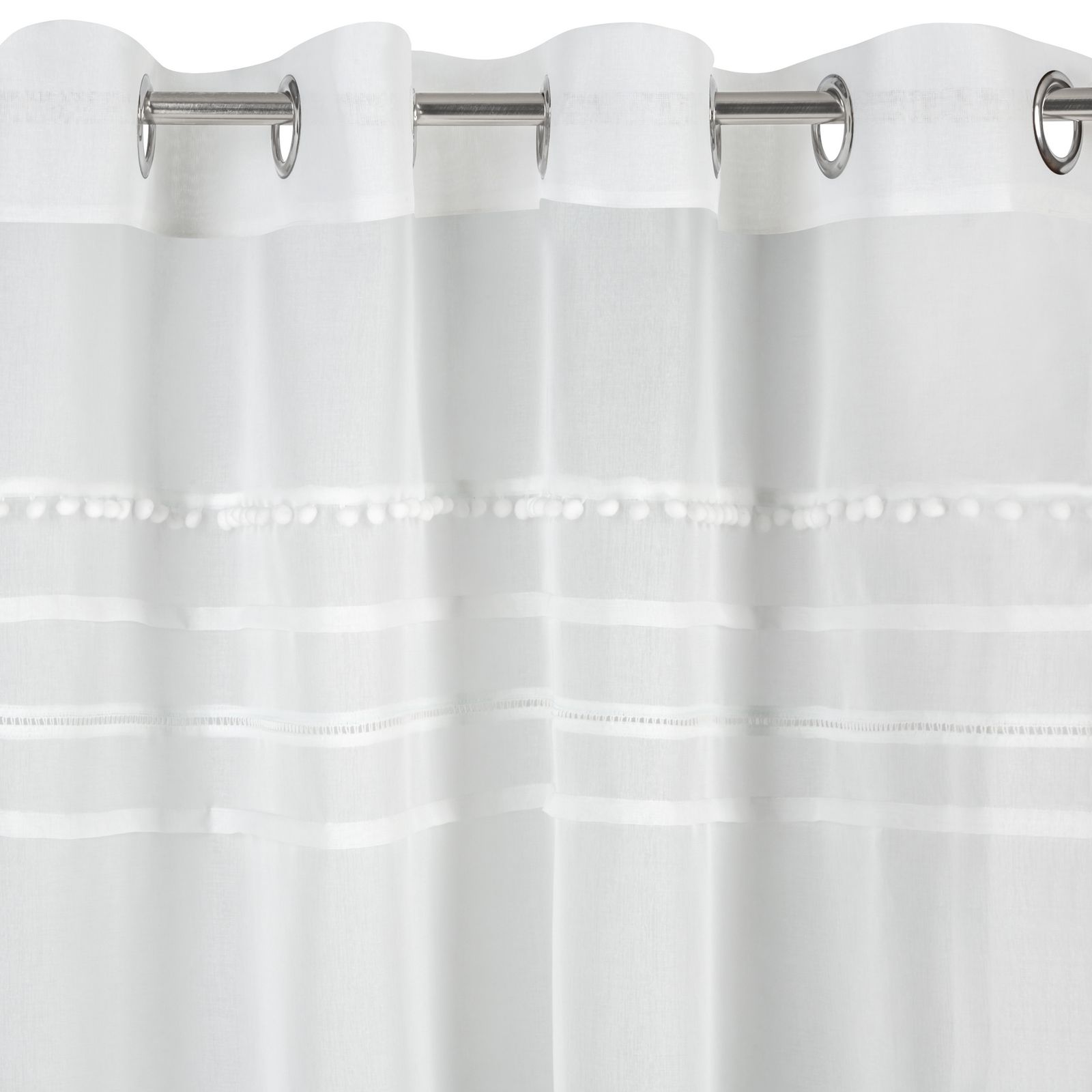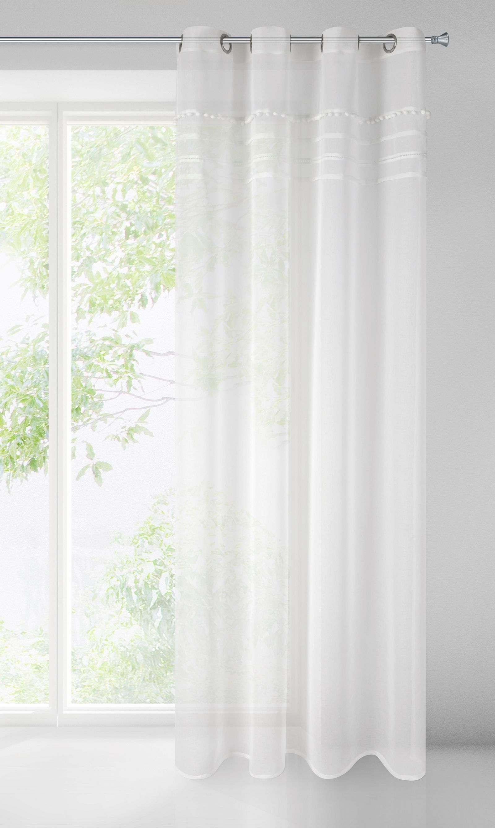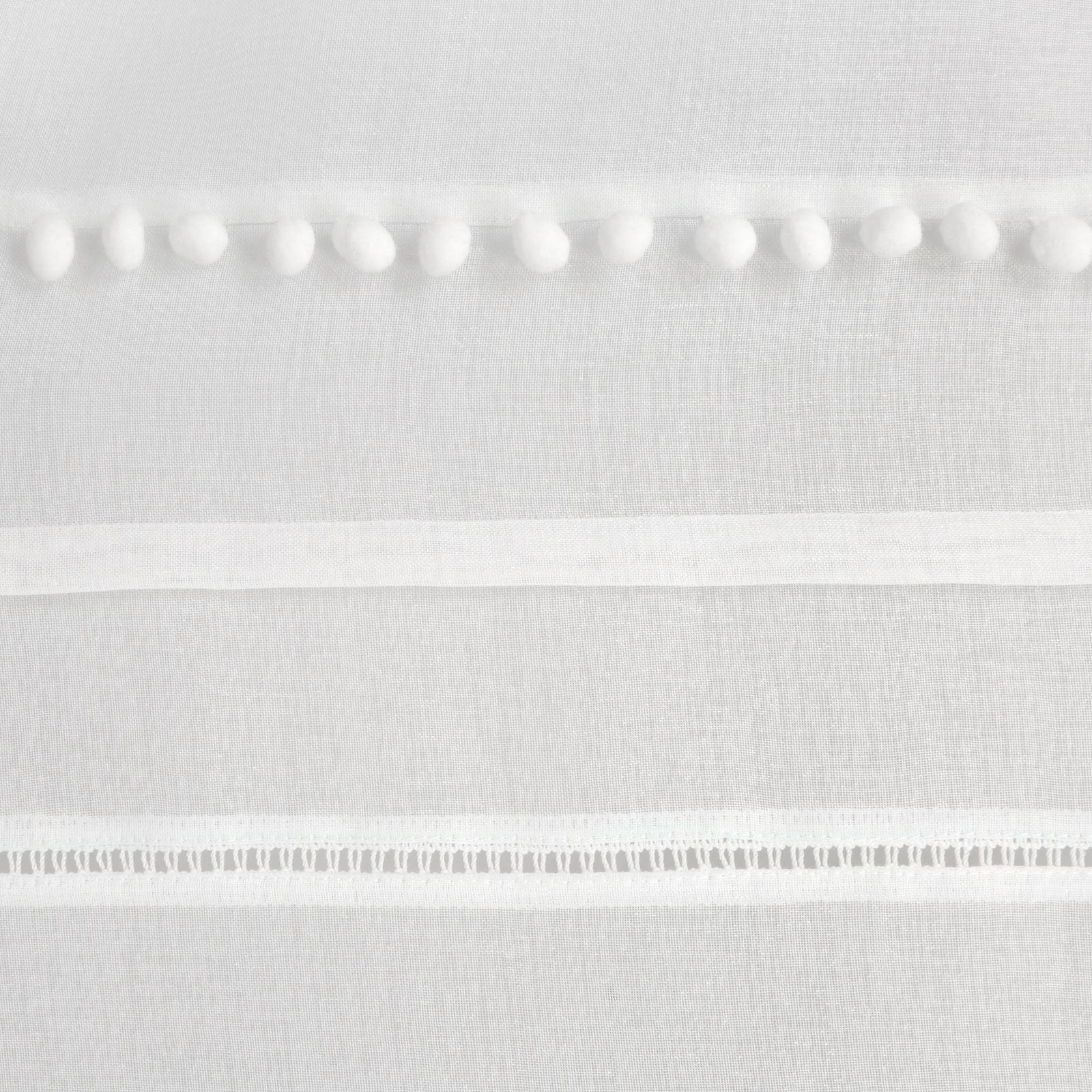 Elegants aizkars ar mūsdienīgu raksturu. Gludā loga apdare augšējā daļā ir rotāta ar četriem dažādiem rotājumiem, tostarp bumbuļiem un kristāliem. platums: 140 cm, garums: 250 cm, krāsa: balta, gramatūra: 66 GSM, sastāvs: Sastāvs: 100% poliesteris.