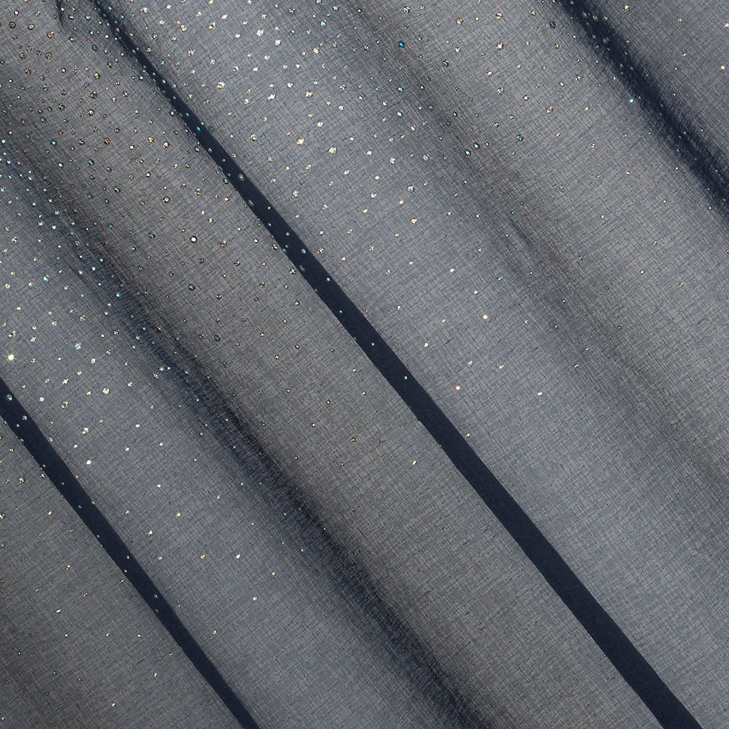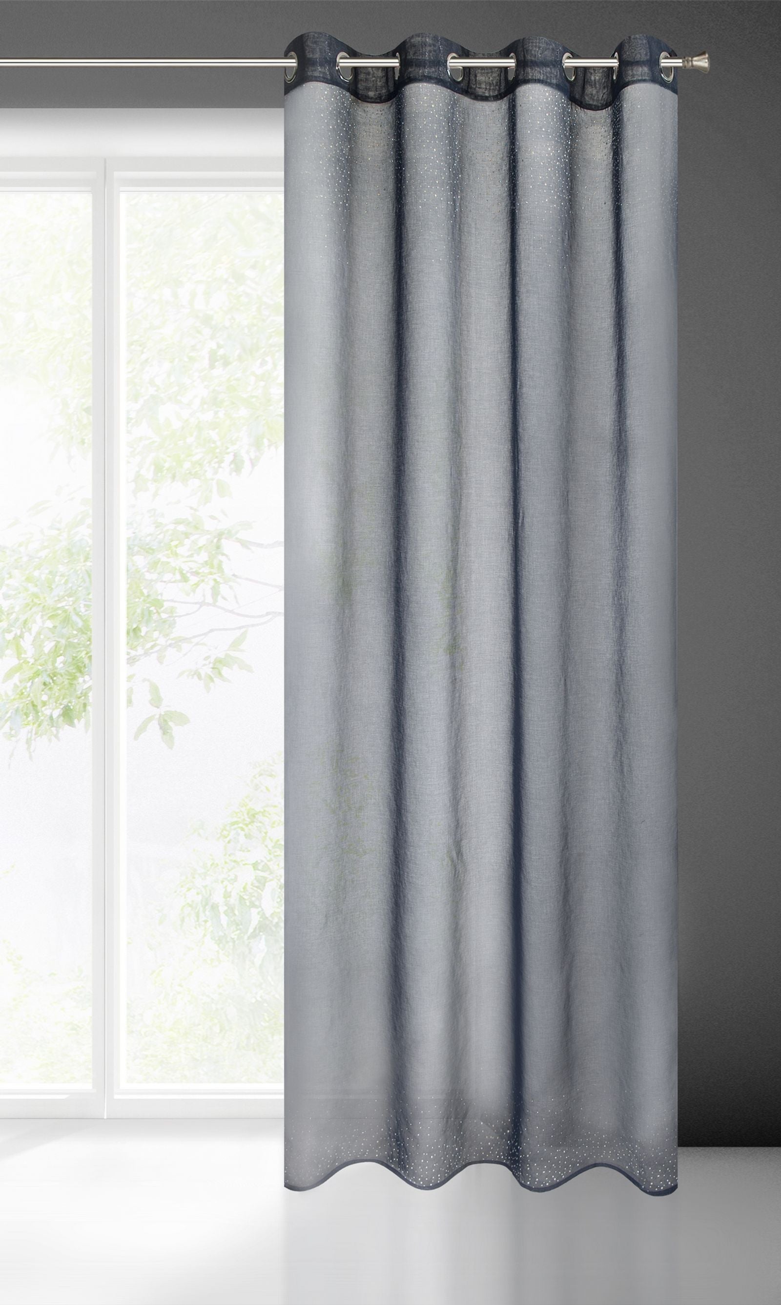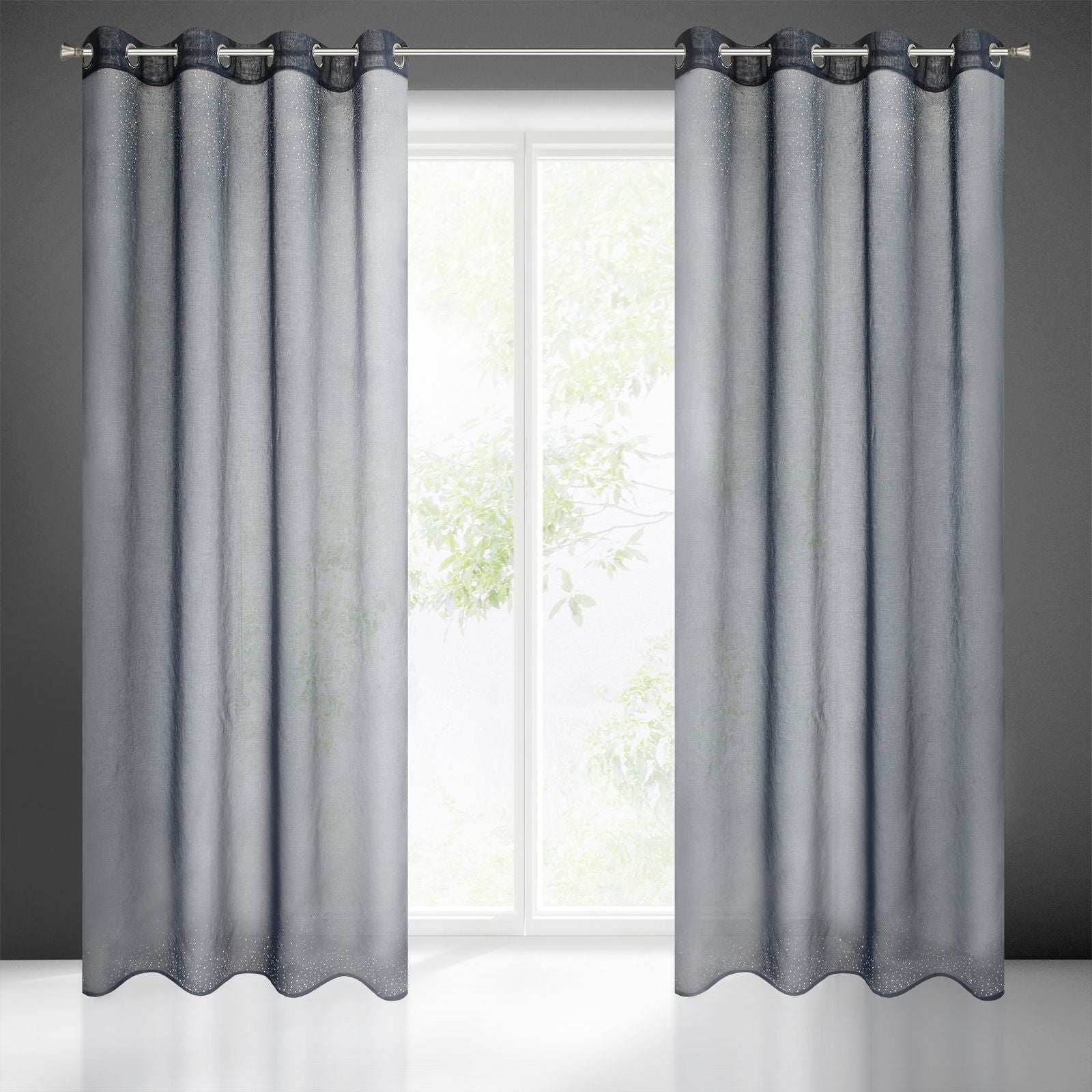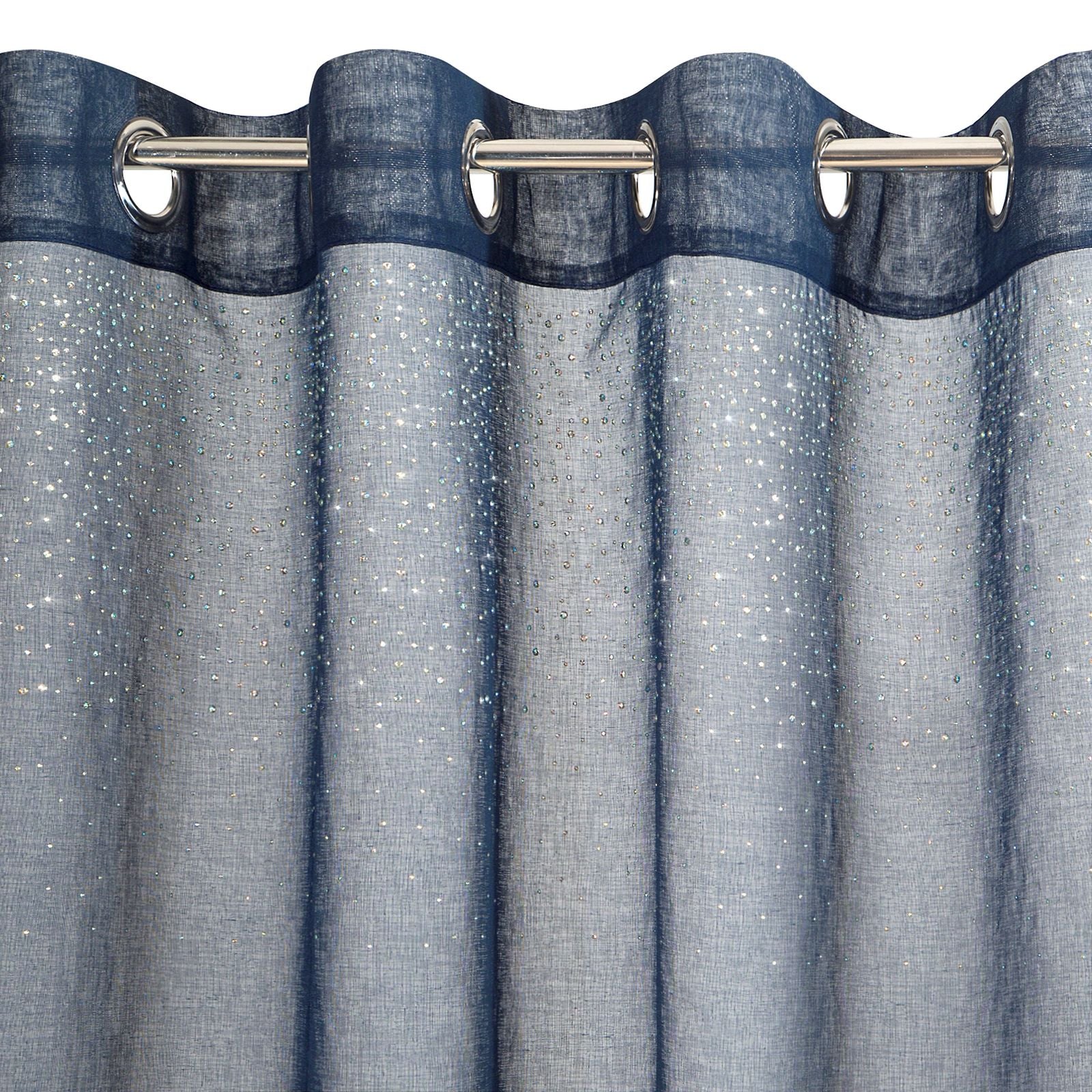 Delikāts tumši zils aizkars ar modernu glamūra raksturu. Mīksts, viegls audums, kas augšējā daļā rotāts ar rhinestones joslu. Ļoti gaisīgs. platums: 140 cm, garums: 250 cm, krāsa: tumši zila, svars: 70 GSM, sastāvs: Sastāvs: 100% poliesteris.