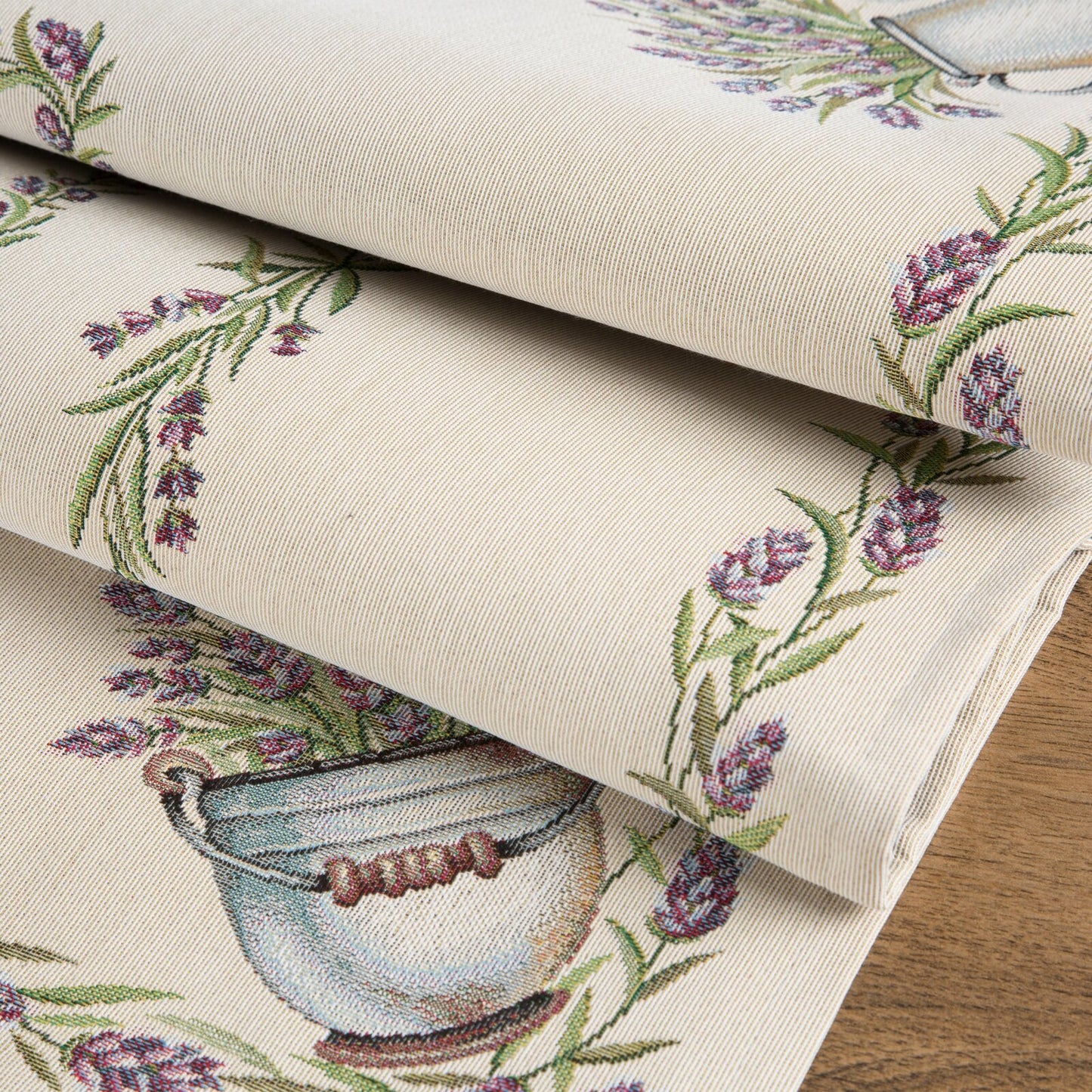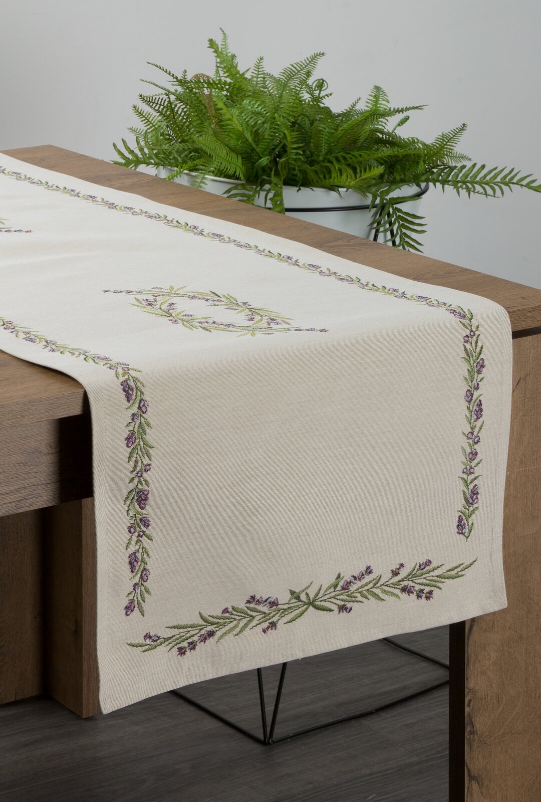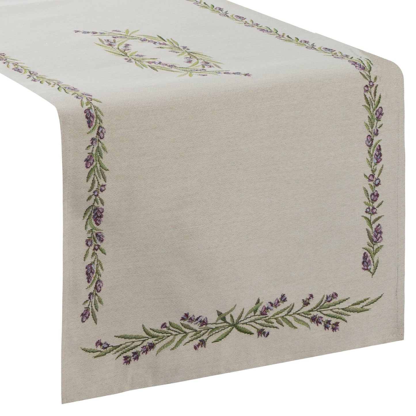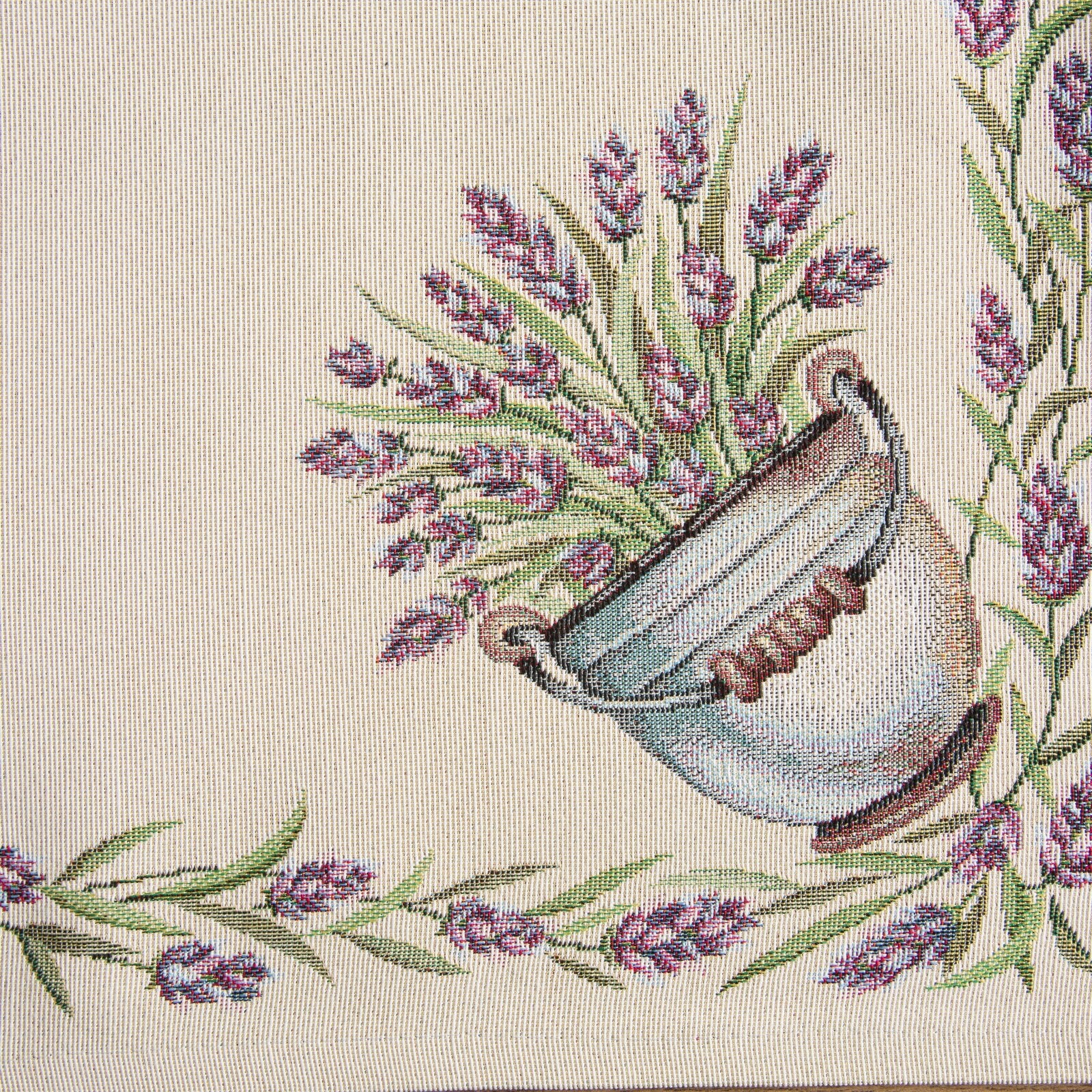 Gobelēna galdauta platums: 45 cm, garums: 140 cm, krāsa: dabīga, svars: 410 GSM, sastāvs: Sastāvs: 75% poliestera, 22% kokvilnas, 3% akrila.