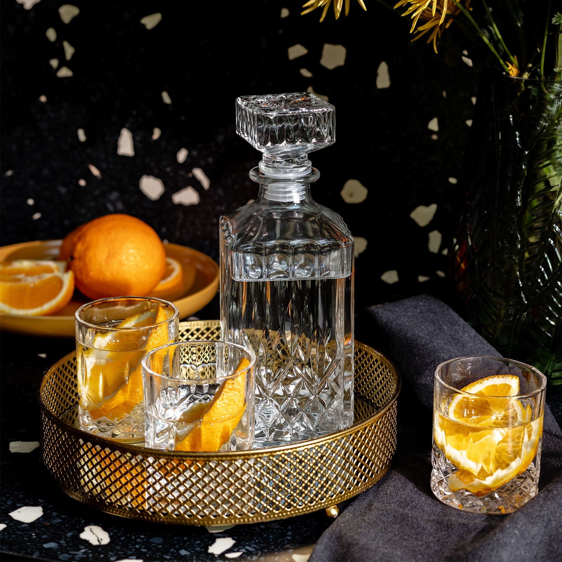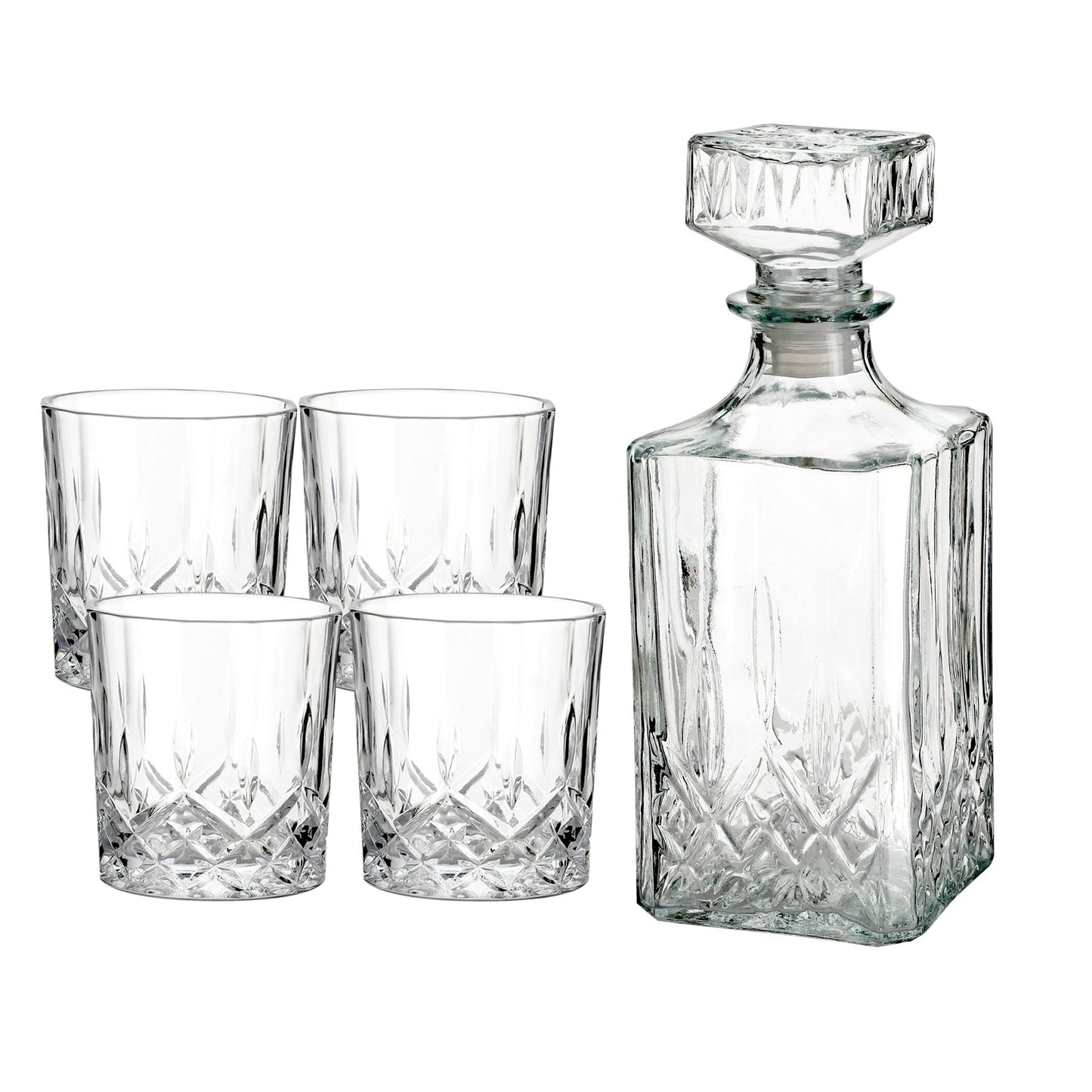 Das Set beinhaltet eine schöne, schlanke 0,95-Liter-Karaffe, die sicher in der Hand liegt, und 4 Gläser mit 0,2-Liter-Inhalt. Alle Schalen bestehen aus transparentem Glas, das mit einzigartigen Rillen mit Pflanzenmotiv verziert ist. Der Dekanter eignet sich perfekt zum Servieren von Likör, Whiskey und Saft an Sommernachmittagen.