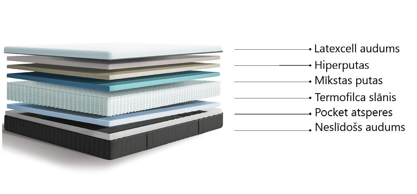 Trikotāžas audums stepēts ar lateksa putu ļaus sasniegt maksimālu komfortu, un pilnībā ortopēdiskais  efekts nodrošinās jums jaunu komfortu miegu līdzsvarā ar Pocket atsperu sistēmu, kas sadala spiedienu vienmērīgi pa visu matraci.