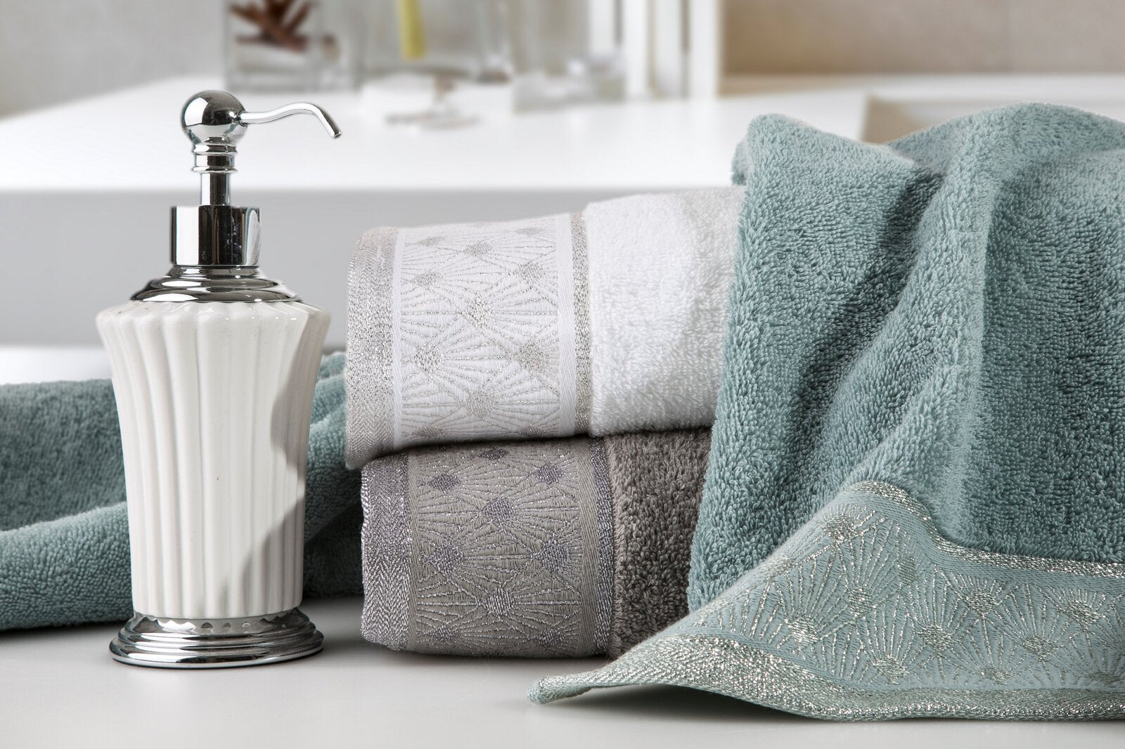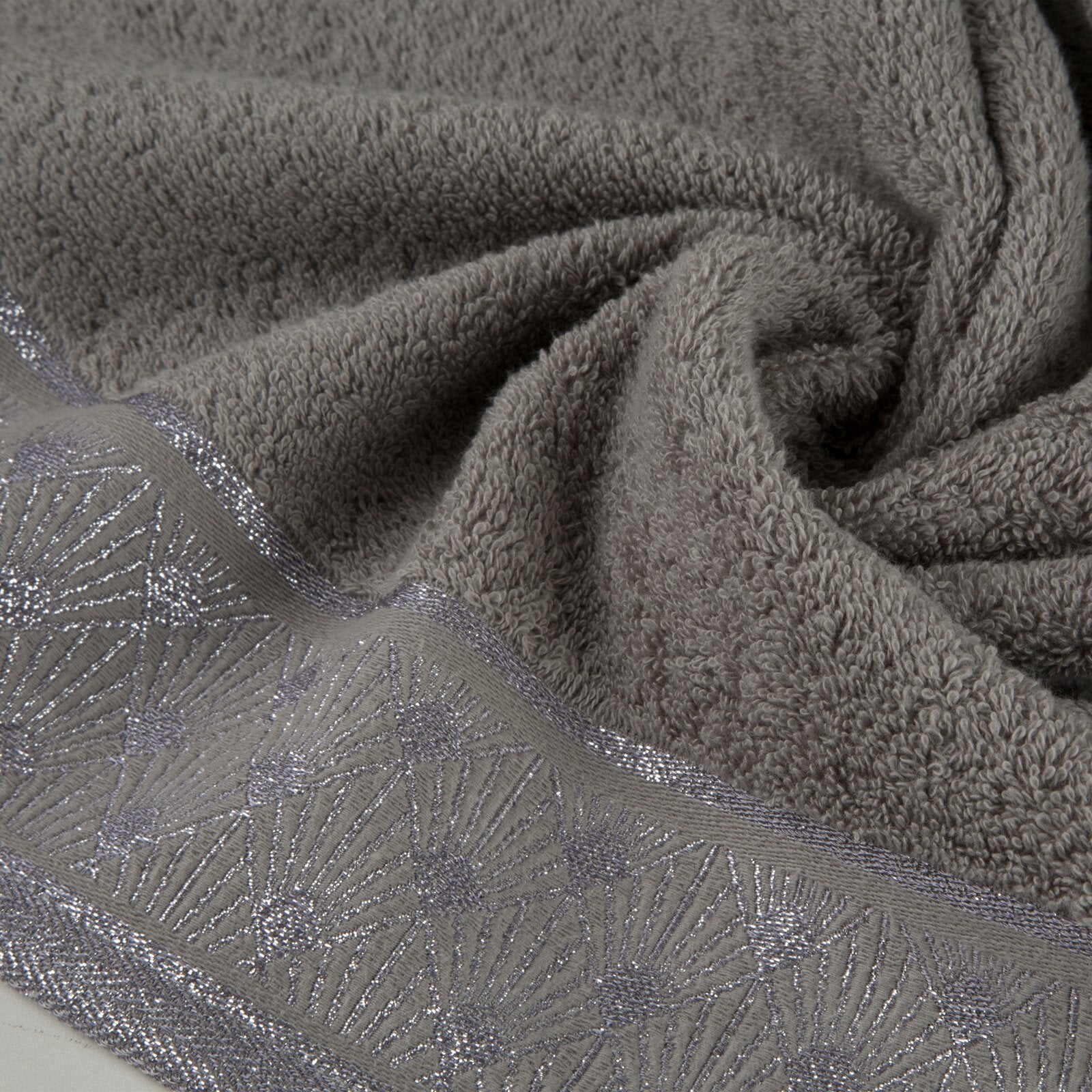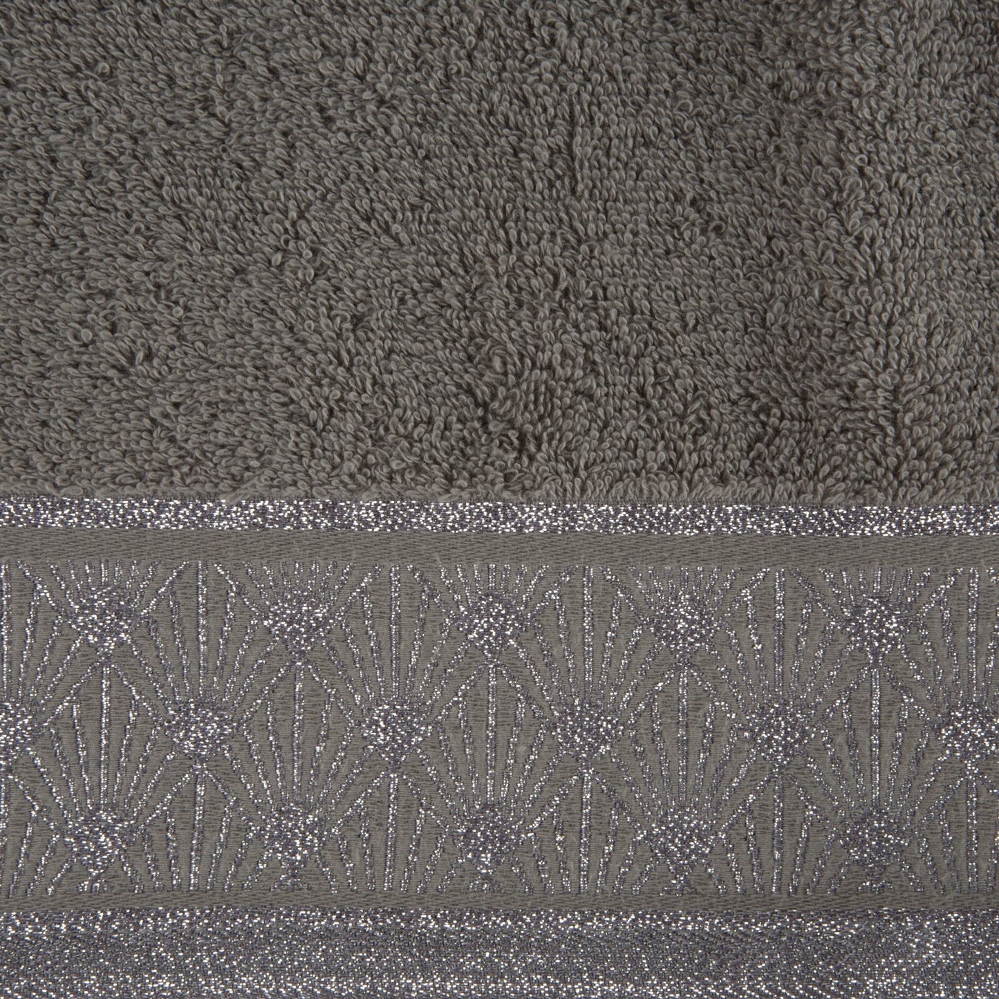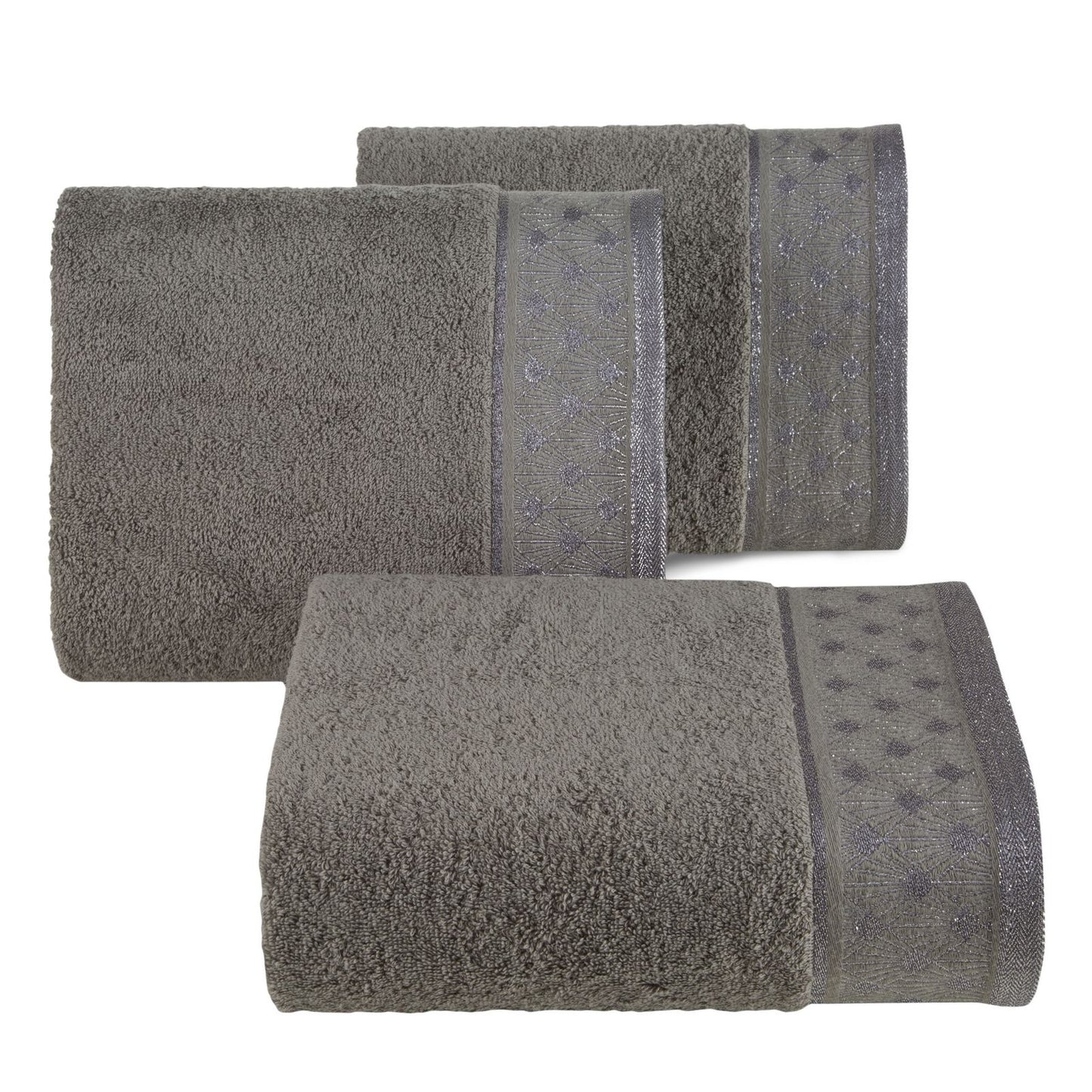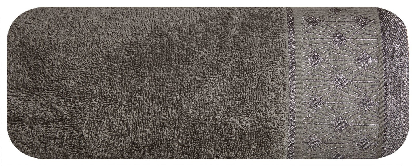 Dvieļu ar ģeometrisko rakstu uz malām platums: 70 cm, garums: 140 cm, krāsa: sudraba, svars: 480 GSM, sastāvs: Sastāvs: 100% kokvilna; 79% kokvilna 21% poliesteris