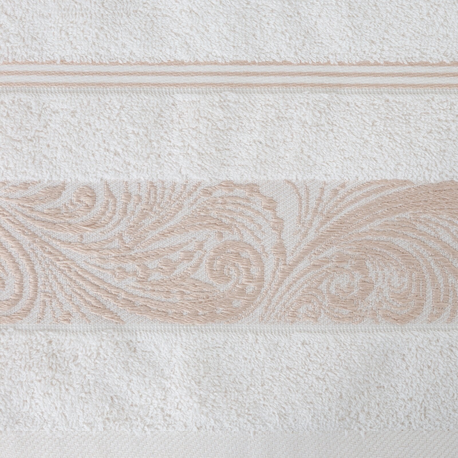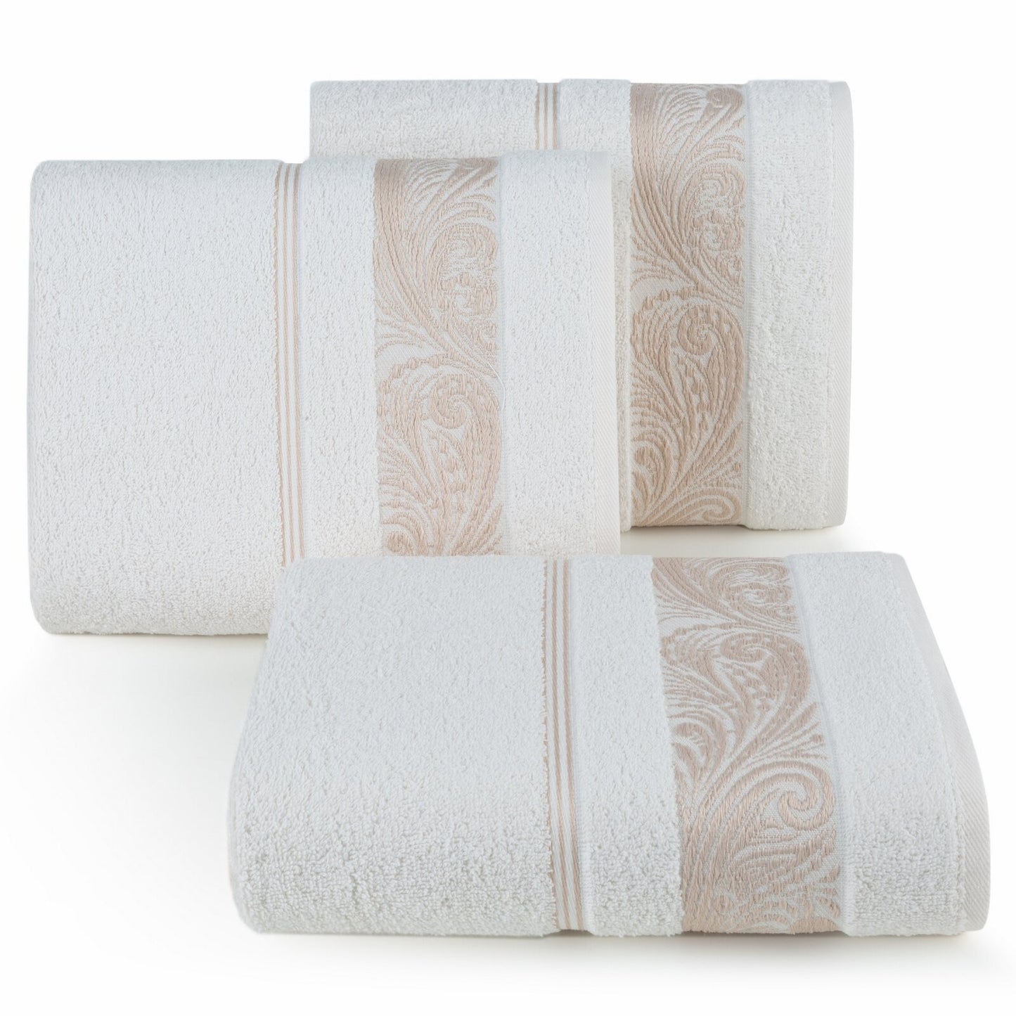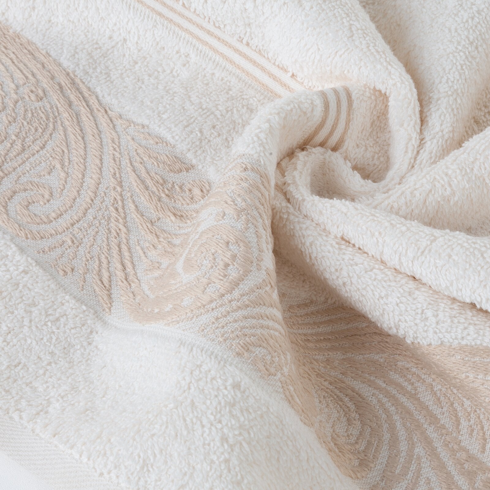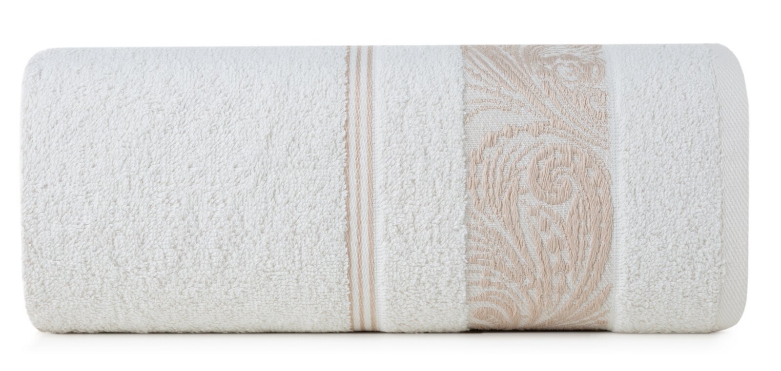 Elegants vannas dvielis no mīksta un uzsūcoša kokvilnas frotē, rotāts ar žakarda apmali ar ziedu rakstu atbilstošā krāsā. Ļoti mīksts un patīkams platums: 70 cm, garums: 140 cm, krāsa: krēmkrāsa, svars: 500 GSM, sastāvs: Sastāvs: 100% kokvilna; 70% poliesteris, 30% kokvilna.