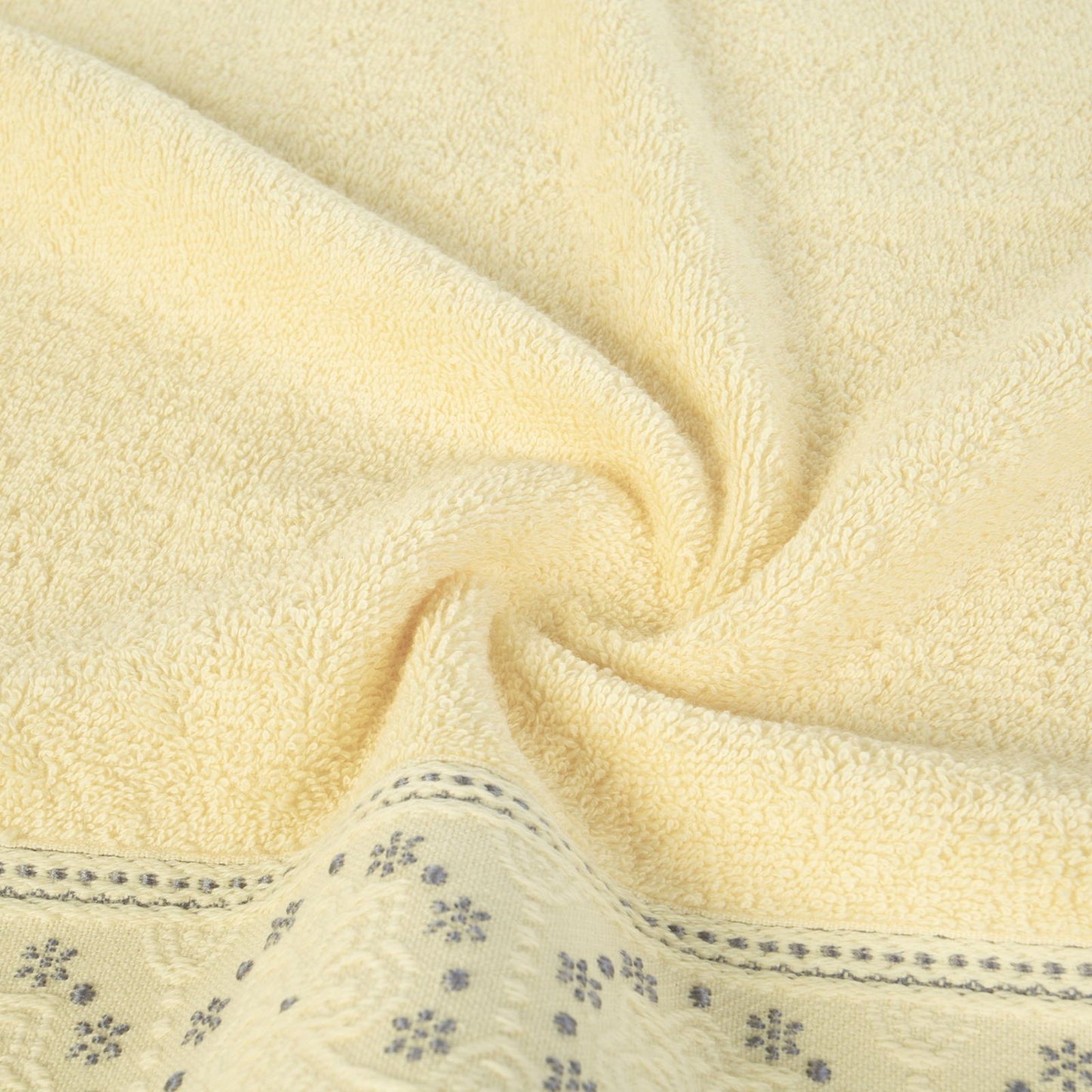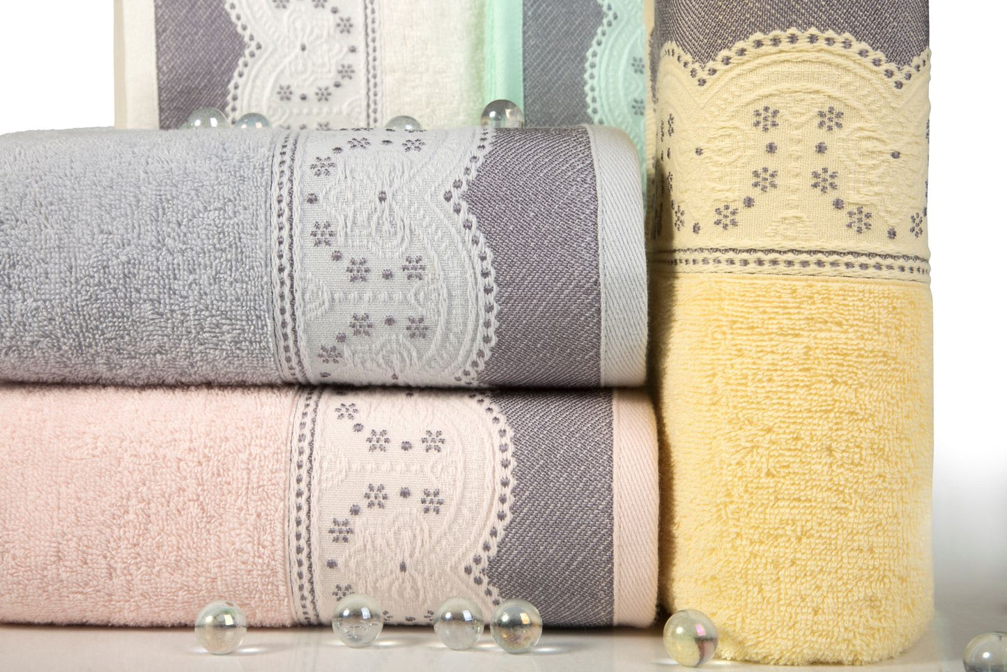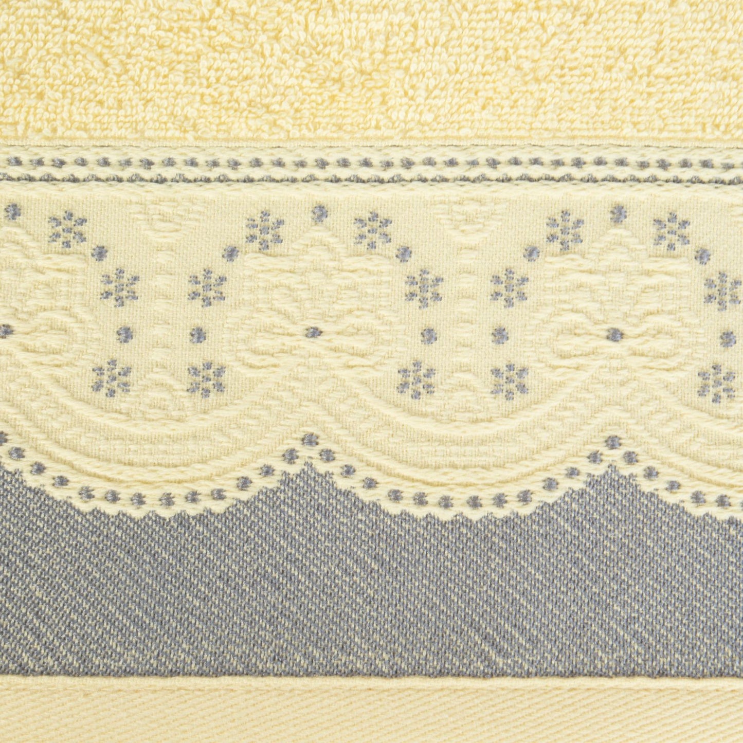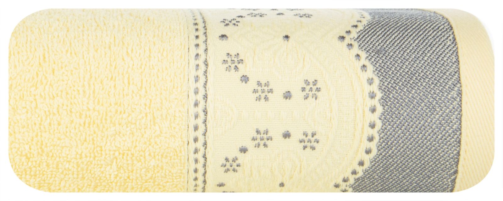Elegants kokvilnas vannas dvielis no frotē auduma. Īsākas malas rotātas ar mežģīnes imitējošu aplikāciju. Viegli mazgājams, nebojājas. Platums: 70 cm, garums: 140 cm, krāsa: dzeltena, svars: 450 GSM, sastāvs: Sastāvs: 100% kokvilna;98% kokvilna 2% poliesteris.