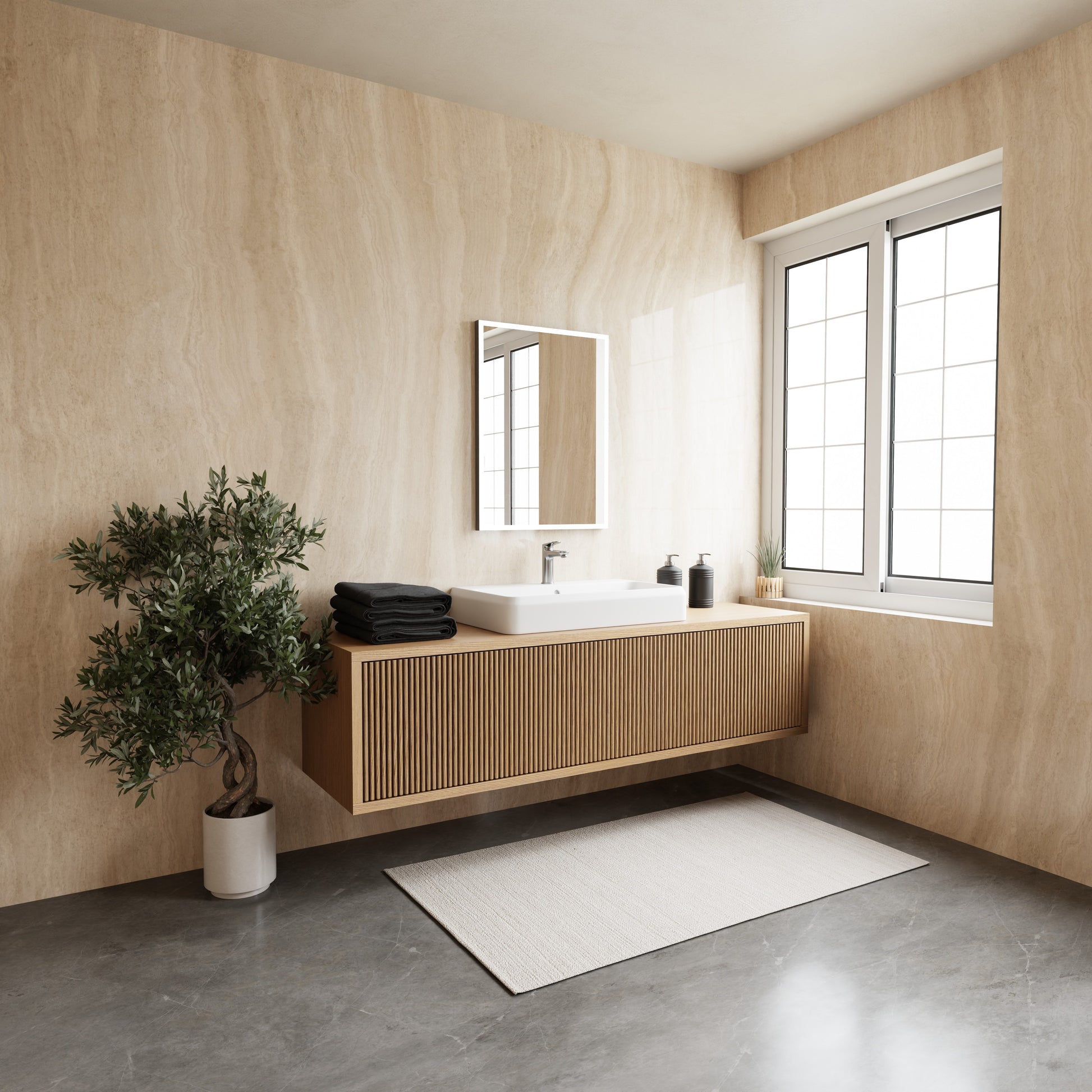 Taisnstūra spogulis ar noapaļotiem stūriem alumīnija rāmī. 1,8 cm platā perimetra josla ir apgaismota ar LED diodēm. Var pakārt vertikāli vai horizontāli. Rāmja krāsa - matēti melna.