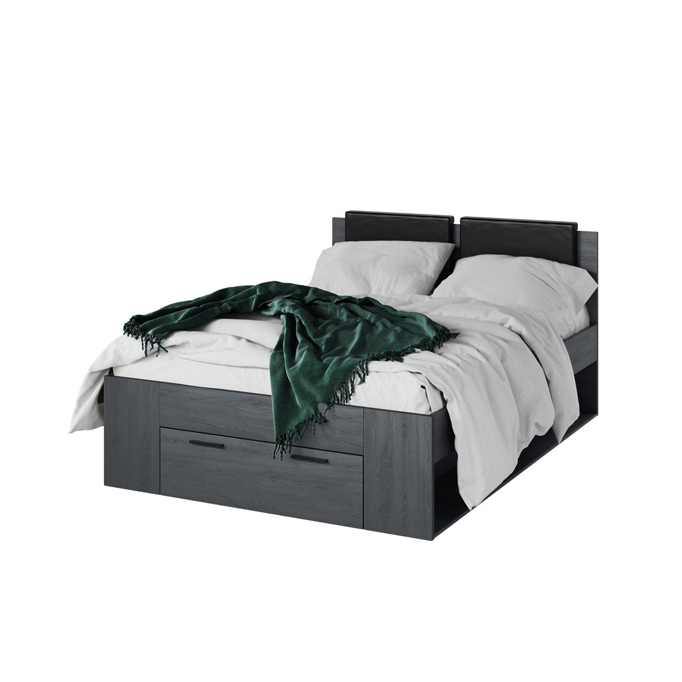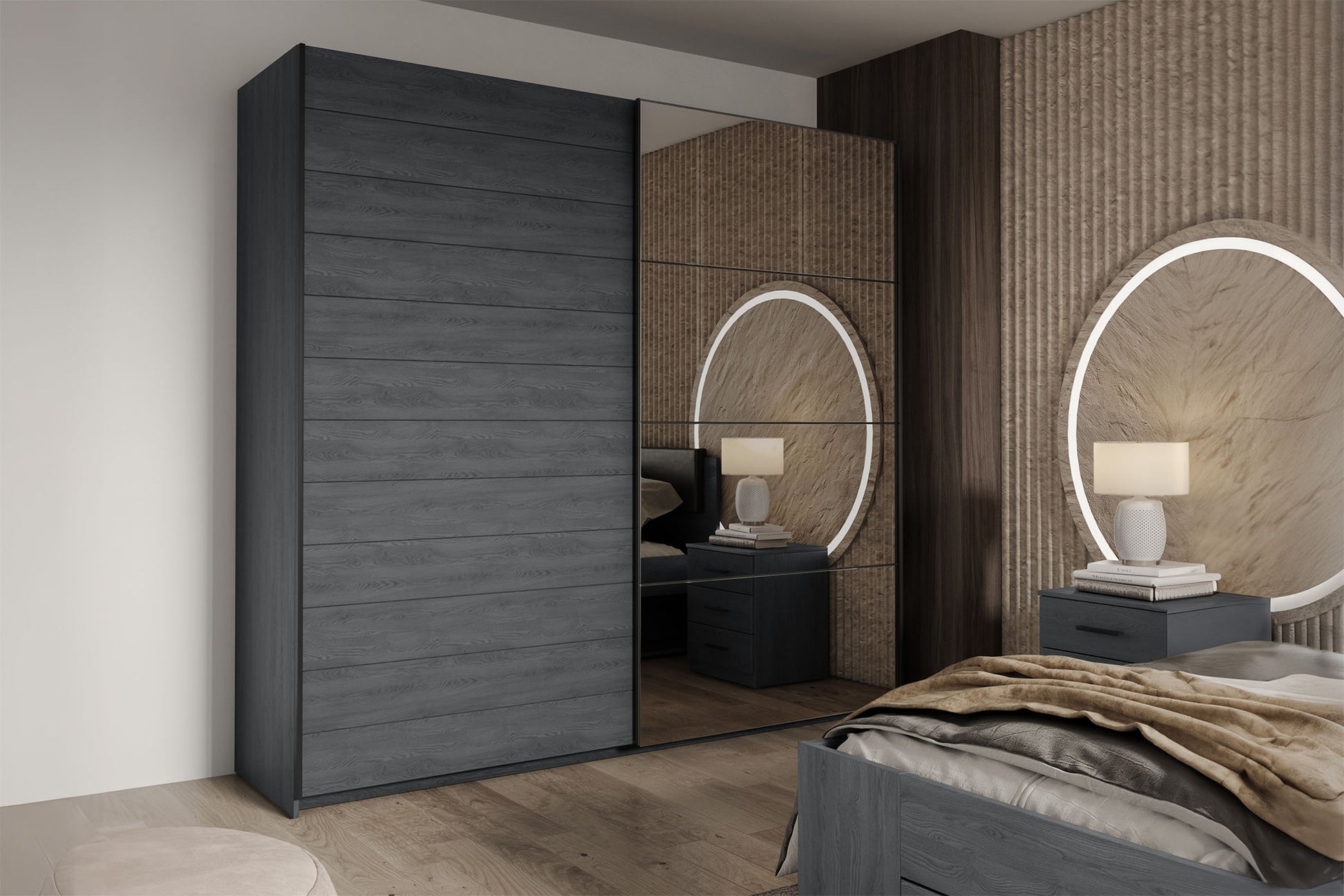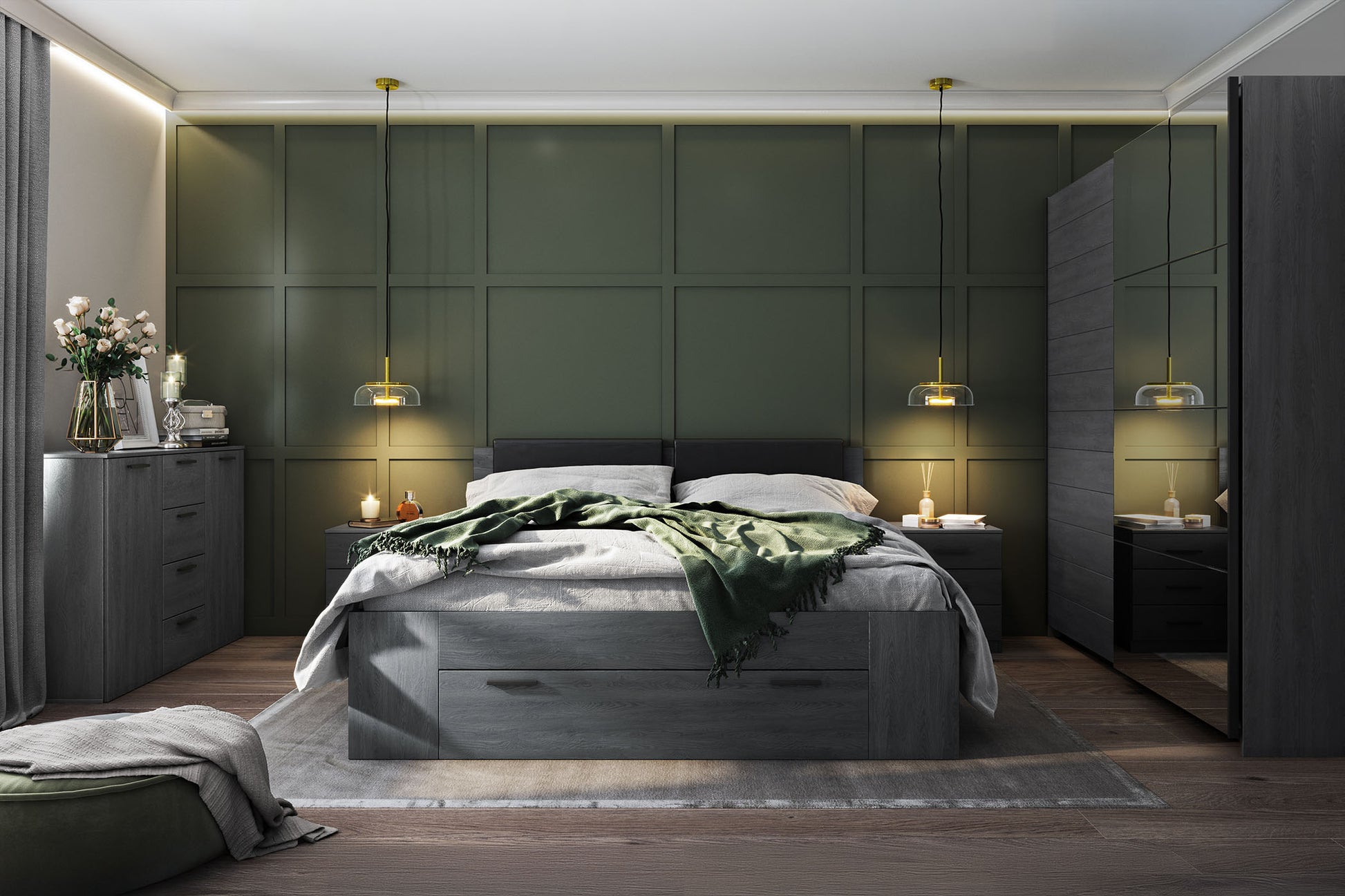 Mūsdienīgā guļamistaba tagad ir pieejama arī modernajā ozolkoka oglekļa dekorā ar dabīgu šķiedru rakstu neparastā grafīta krāsā.